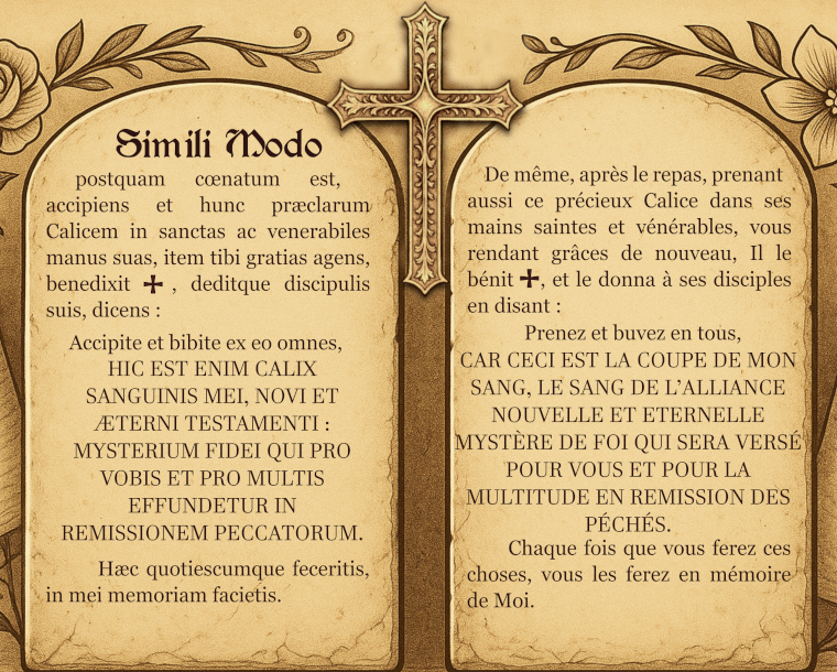 "De la même manière, après le repas, prenant aussi ce très glorieux calice dans ses mains saintes et vénérables, vous rendant grâce encore, il l'a béni et donné à ses disciples en disant, prenez et buvez-en tous, car ceci est le calice de mon sang, celui de l'Alliance nouvelle et éternelle, mystère de la foi, qui sera répandu pour vous et pour beaucoup en rémission des péchés."